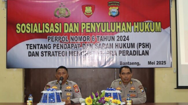 BANTAENG, Sulsel⚡Binkari — Bertempat di aula Endra Dharmalaksana Polres Bantaeng berlangsung Sosialisasi dan Penyuluhan Hukum Perpol Nomor 6 Tahun 2025 tentang saran dan pendapat hukum (PSH) dan strategi menghadapi praperadilan. Rabu (28/5/2025)