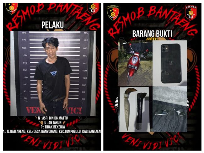 BANTAENG, Sulsel⚡Binkari — Tim Resmob Polres Bantaeng berhasil membekuk A alias Mng bin Mt (46), tersangka pelaku tindak pidana pencurian kendaraan bermotor (Curanmor) yang Merupakan Resedivis Keluar Masuk Penjara. Penangkapan dilakukan pada Senin (21/7/2025) baru – baru ini.