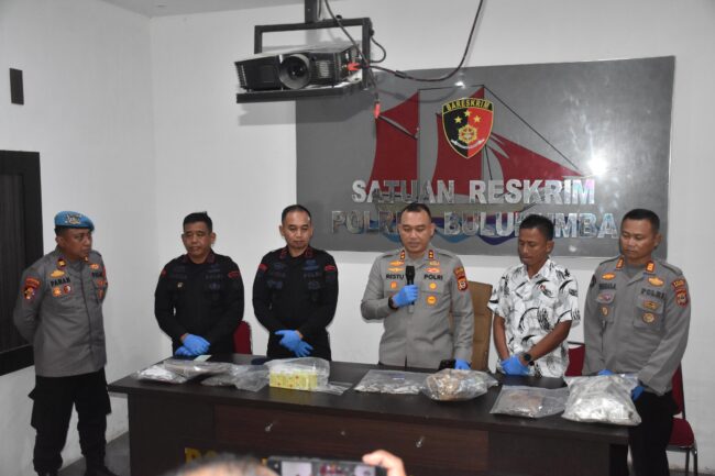 Konferensi pers tersebut dihadiri Kapolres Bulukumba AKBP Restu Wijayanto, S.I.K., didampingi Waka Polres Kompol Syafaruddin, Kasat Reskrim Iptu Muhammad Ali, Kaden Gegana Kompol Mansyur, S.H., M.H., dan Kasubden Jibom AKP Syamsuddin.