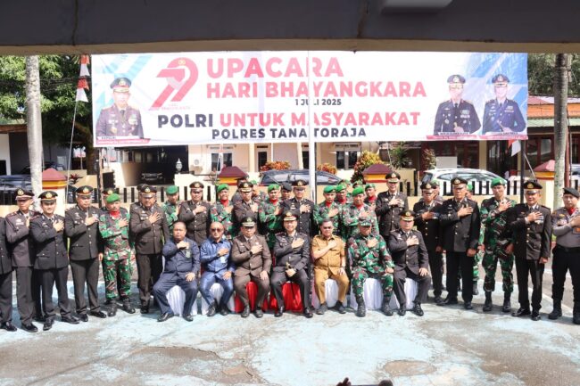 Tana Toraja – Dalam rangka memperingati Hari Ulang Tahun (HUT) Bhayangkara ke-79 tahun, jajaran Polres Tana Toraja (Tator) gelar upacara dan dilanjutkan dengan acara syukuran HUT dengan tema Polri Untuk Masyarkat di halaman Mapolres Tana Toraja, Selasa (1 Juli 2025).