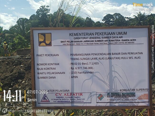 Binkari Aceh, Kutacane⚡️Binkari — Proyek pembangunan pengendalian banjir dan perkuatan tebing Sungai Lawe Alas (lanjutan) Hulu WS Alas dengan nilai kontrak sebesar Rp 6.977.746.000 yang dikerjakan CV. Alfatir selaku kontraktor pelaksana dan diawasi CV. Centrina Engineering, kini menuai sorotan. 7 September 2025.
