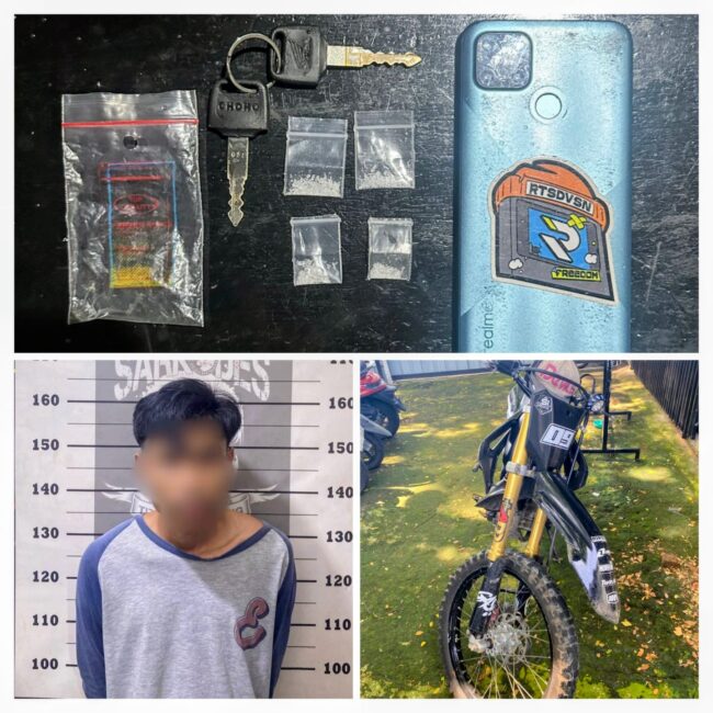 “AS ditangkap saat berhenti di pinggir jalan dengan sepeda motor CRF. Saat penggeledahan, pelaku mencoba mengelabui petugas dengan menjatuhkan satu sachet besar berisi empat sachet shabu dari saku celananya. Gerak-gerik tersebut berhasil diamati petugas sehingga pelaku langsung diamankan dan dibawa ke Posko Narkoba Polres Bantaeng untuk pemeriksaan lebih lanjut,” ujar Kasat Hendra.
