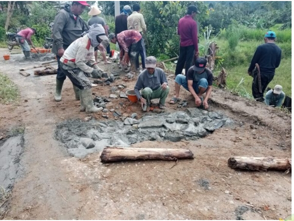 LAMPUNG BARAT, Lampung ¶ Binkari – Bentuk kepedulian Dede Suherli selaku Peratin (Kepala Desa) Pekon (Desa) Mekarjaya, Kecamatan Gedung Surian, Kabupaten Lampung Barat, bersama warganya berjibaku memperbaiki gorong–gorong dan penambalan jalan rabat beton berlokasi di Pekon Puramekar jalan penghubung Pekon Mekarjaya dan Pekon Puramekar, Jum’at, (28/10/2022).